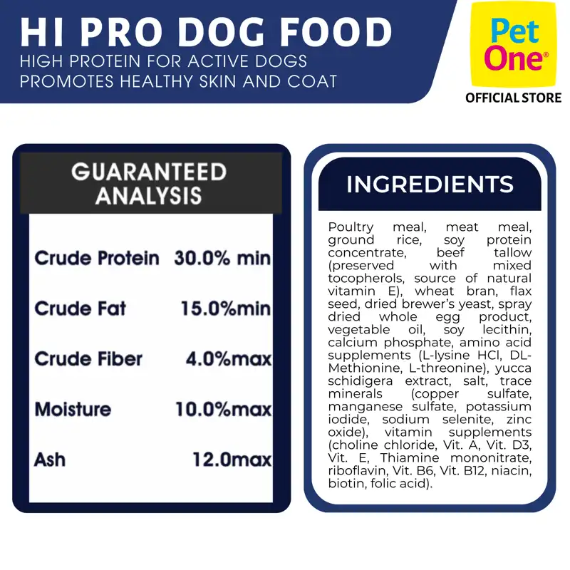 Bột gia cầm, bột thịt, gạo xay, đạm đậu nành cô đặc, mỡ bò (được bảo quản bằng hỗn hợp tocopherols – nguồn vitamin E tự nhiên), cám lúa mì, hạt lanh, sản phẩm trứng nguyên quả sấy phun, dầu thực vật, lecithin đậu nành, canxi phosphat, các axit amin bổ sung (L-lysine HCl, DL-methionine, L-threonine), chiết xuất yucca schidigera, muối, khoáng vi lượng (đồng sunfat, mangan sunfat, kali iodua, natri selenit, kẽm oxit), các vitamin bổ sung (choline chloride, vitamin A, vitamin D3, vitamin E, thiamine mononitrate, riboflavin, vitamin B6, vitamin B12, niacin, biotin, axit folic).