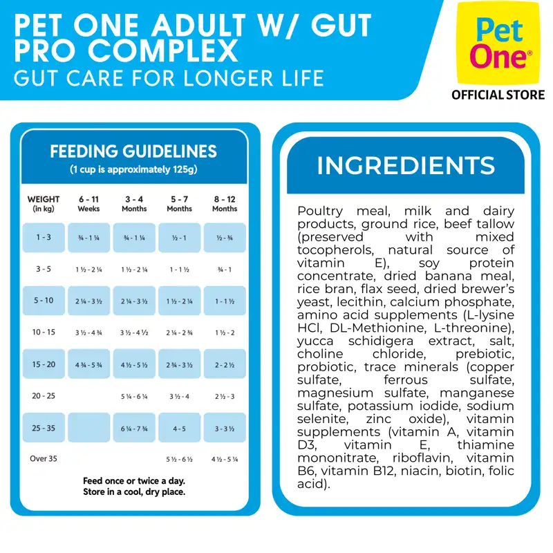Việc thay đổi thức ăn cho thú cưng nên được thực hiện một cách từ từ. Thức ăn mới nên được trộn với thức ăn hiện tại của chó theo từng lượng nhỏ. Dần dần tăng lượng thức ăn mới và giảm lượng thức ăn cũ trong vòng một tuần, cho đến khi thức ăn được thay thế hoàn toàn bằng PET ONE PUPPY FOOD.